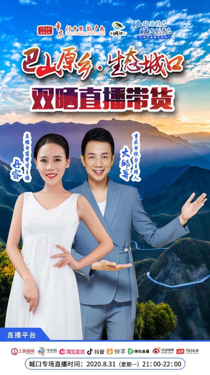8月31日晚间18:30重庆卫视《重庆新闻联播》将播出城口县长“双晒”直播预告。晚间 20:00 在华龙网、上游新闻、重庆卫视新媒体和淘宝、抖音、新浪微博等网络平台,同步实时直播。直播分两个时段进行,第一时段县长黄宗林通过直播介绍城口的大美山川,品鉴独特文化。第二时段将由主播推荐城口特产好物。